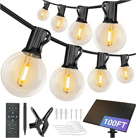 - Solar String Light: 100 FT LED outdoor lights come with 50 G40 LED bulbs and 1 spare bulb, with a 5-foot power cord, 22 inches bulb spacing,emiting 2700K warm white light, solar patio lights perfect for creating a relaxing atmosphere in gardens, patios, or pergolas.