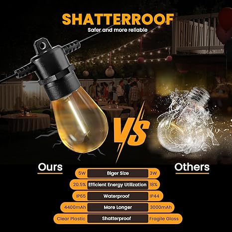 - 【All Weather-resistant & Shatterproof Outdoor Lights】Designed with strong rubber strands and fully-sealed sockets, Our solar lights outdoor waterproof can withstand cloudy, damp, windy, foggy, rainy, snowy, or extreme temperatures,This makes them perfect for year-round use in outdoor spaces like patios, gardens, and Camping, creating a festive and inviting atmosphere.Besides, these led bulbs made from unbreakable PET material and hard anti-drop plastic shells,are light and safe, and have better anti-fall ability