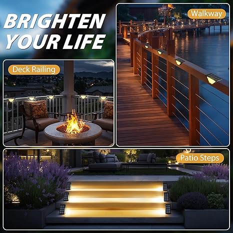 - 【Two Types of Installation】Choose the installation method that best suits your needs: 1. Use the 3M tape to stick the lights directly to your stairs. 2. Attach them securely to your fence or deck using the included screws and bolts. For best performance, install in a sunny spot.