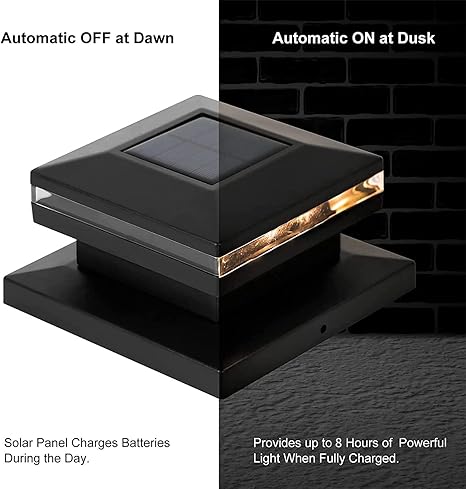 - High Performance Solar Lights: Manufactured from durable, vinyl (PVC) the post lights will not fade, crack. Each cap offers a monocrystalline solar panel and 1.2V 1000mAh rechargeable NI-MH battery battery stays lit for up to 8 hours after charged in the daytime for 6-8 hours under the sun, and for many years of maintenance-free reliability.