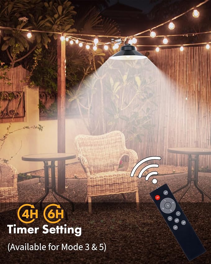 - Easy to Operate: Our Solar Pendant Lights come with a remote control that allows you to effortlessly turn them on/off, switch modes, adjust brightness and color temperature, and even set a timer (4H/6H)