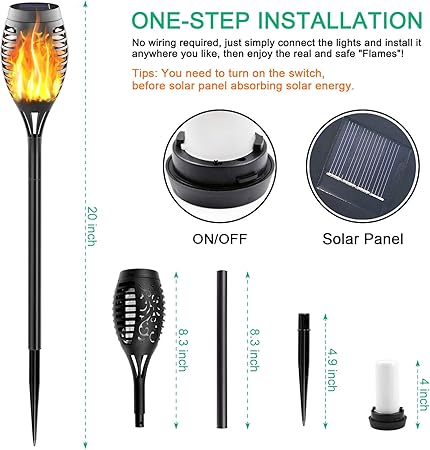 - 【Solar Torch Light with Flickering Flame】- The solar flame light is a safe alternative to real flame. Flickering flames cast a soft and pleasant glow. These are Mini torches with the total length 20 inches and diameter 3 inches.