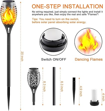 - Easy to Install and Widely Used: Installing solar flame torch lights is very easy. No wiring is required, just place it in a sunny area and push it underground. Outdoor waterproof solar decorative lights are very suitable for use in various places, including gardens, courtyards, lawns, flower beds, terraces, terraces, sidewalks, paths, driveways, etc