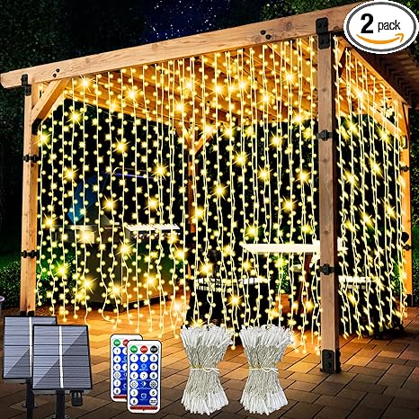 - 【Upgraded Solar Outdoor Curtain Lights】: The solar outdoor curtain lights use a 3m x 3m transparent cable, 300 super bright warm white LEDs, 10 hooks, an upgraded smart remote control, a new design with solar panels, durable and friendly to use. It’s ideal for gardens, camps, yards, bedrooms, pavilions, etc. Our string lights are suitable for many occasions, such as celebration party and grand ceremony, and also can be uesd for Interior decoration and lighting.