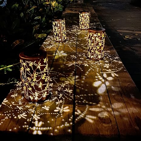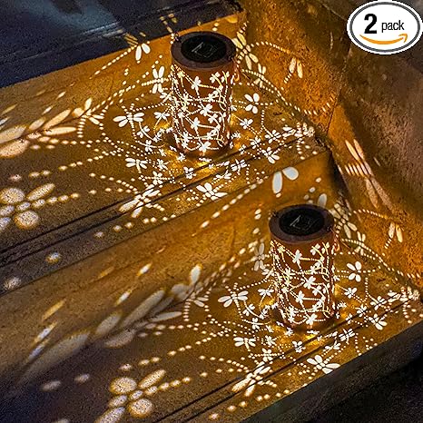 - Gorgeous & imaginative Garden Decor – Fusion the retro gold, copper of exteriors and irregular pattern inside, at darkness, the solar lantern casting a bright, warm light with dragonfly pattern, which looks like a dragonfly flying symbolizes change.