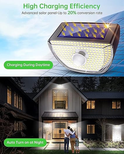 - 【Sensitive PIR Motion Sensor Light】Built-in enhanced PIR motion inductor, these outdoor solar lights can detects people up to 26 feet within angle of 180°. When motion is detected within 3-5m, the solar motion sensor lights will turn on automatically in darkness or at night. Whousewe solar powered lights makes your life more convenient.