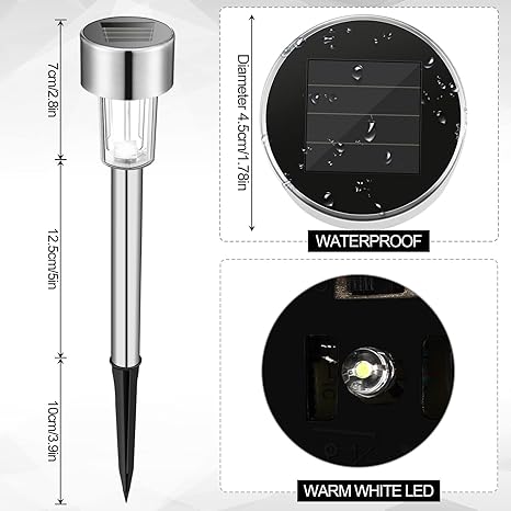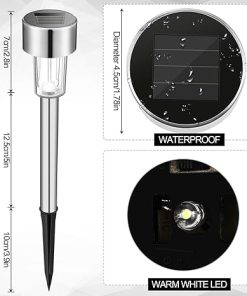 - Solar Lights Waterproof and Durable: solar pathway lights are made of corrosion resistant stainless steel for long lasting durability.we have improved the quality of the rods and pegs, making them stronger. IP44 waterproof solar outdoor pathway lights resist all types of weather for a long period of time.No worries about rain, snow, frost or sleet. you can use it in any outdoor scenes and places, such as gardens, lawns, villas, paths or yards. The cool white light helps to create a romantic and comfortable atmosphere