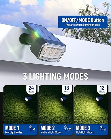 - 🌞【Charges Faster,Works Longer】: AUDERWIN Solar Floodlights use monocrystalline laminated solar panels with the highest charging efficiency, the outdoor motion sensor light can be fully charged within 6 hours during the day. With a high-quality 1800mAh battery, our solar fence light can work for 12-20 hours at night.