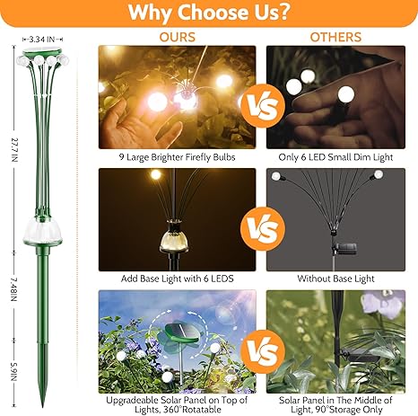 - 【Swaying in the Wind solar lights outdoor waterproof, As Real Fireflys】Our new generation solar garden lights outdoor is propped by very soft & flexible wires, so the outside lights sways when the wind blows, exactly like a cluster of firefly flying in the dark. The firefly lights solar outdoor have 9 larger and brighter LED premium bulbs, almost similar lights in the market just has only 6 LEDs bulbs and smaller.It is the great garden decor.