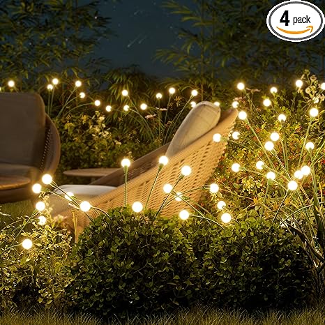 - 【All Weather Resistant& IP65 Waterproof】With an IP65 waterproof rating, the solar lights outdoor waterproof decorative are specially designed to withstand bad weather conditions, no more worry about rain, snow, frost, or sleet. Corrosion resistant ABS plastic can ensure long lasting life and durability of this garden lights solar powered decorative. The bright solar fairy lights given off by this firefly solar garden lights can light up your way home when no light source is available.