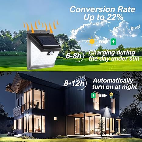 - [High Efficient Solar Lights]: These solar motion sensor lights are made of more energy saving laminated solar panel and premium LED lights, which will be more durable and suitable for longer usage time. The conversion rate reaches up to 17% and with 2200 mAh rechargeable lithium-ion battery allows the led solar lights to be continuously illuminated for longer periods of time to meet your lighting needs.