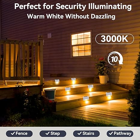 - IP44 Waterproof & Stable and Durable: Our solar lights outdoor waterproof effectively prevent water and dust from entering the interior, ensuring normal use in various bad weather conditions; It has a long service life, reducing the frequency of replacement. This solar step lights are made of hard high-quality ABS and PVC shell materials, which will not rust, are not prone to fading and cracking