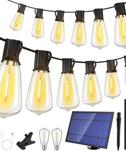 - [Warm Ambiance & Versatile Installation] Create a cozy atmosphere with our 2200K color temperature. Lights automatically turn on at dusk. Solar panel can be mounted on the ground, wall, or clipped for versatile use