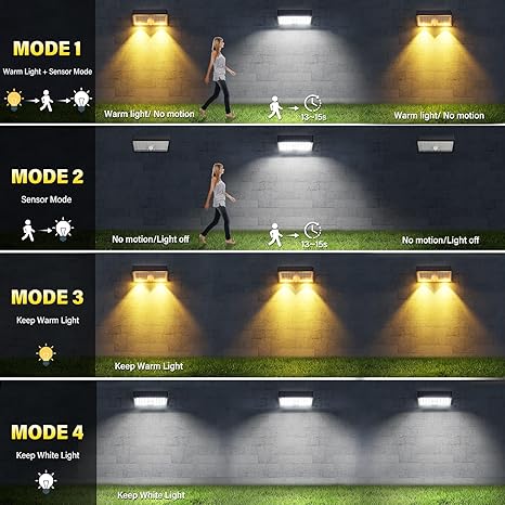 - 4 Lighting Modes & Energy-efficient: Features 36 white LEDs and 2 warm light beads at the bottom. Mode 1: Warm light (no motion)- Bright white light (motion detected). Mode 2: Off (no motion)- Bright white light (motion detected). Mode 3: Constant warm light. Mode 4: Constant bright white light