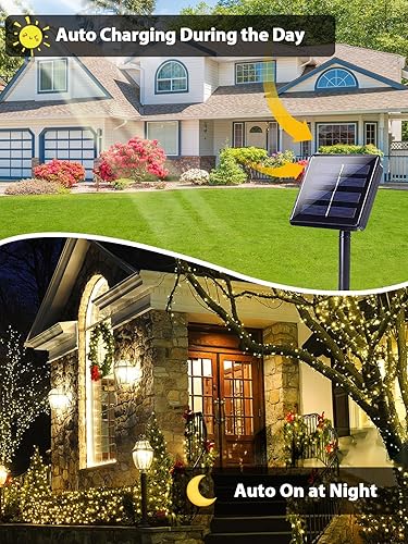 - 2025 New Upgraded Solar Christmas Lights: These solar string lights feature super-bright enhanced LED bulbs and offer 8 versatile lighting modes, a memory function, and auto on/off for effortless operation. With a larger solar panel, they achieve a higher energy conversion rate, while the larger capacity battery ensures extended illumination. Perfect for adding a festive touch, these twinkling lights on a green wire are ideal for decorating your home, yard, or outdoor spaces