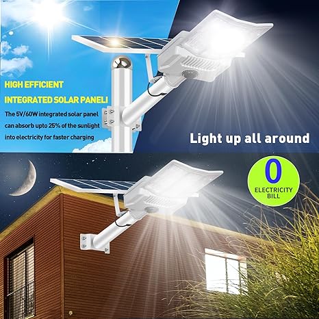 - [No electricity bills] 6000W solar street light provides bright day light at night; 144pcs bright 5450 chips lamp beads, 5v/60000mah battery (lifetime up to 50,000 hours+), Charging for 6-8H, continuous use for more than 12 hours. No extra hard-wire needed, which saves costs on installation and maintenance.
