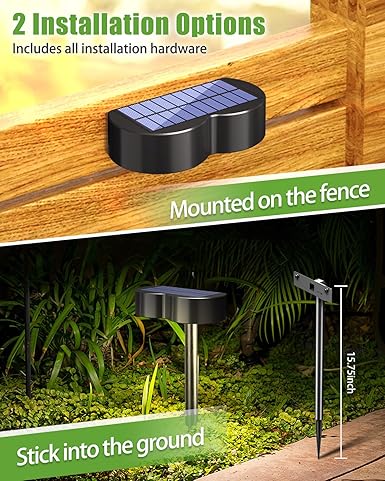 - 【2 in 1 Solar Ground Lights & Outdoor Fence Lights】Our solar lights have two installation methods: ground insertion and wall-mounted. You can easily install it on the ground with stakes or on the wall with the included nails, with minimal effort. When using ground insertion, you can also adjust the solar lights within the range of 0-90° up and down to meet your different lighting needs. Great for outdoor use such as patio, house, garden, fence, and deck.