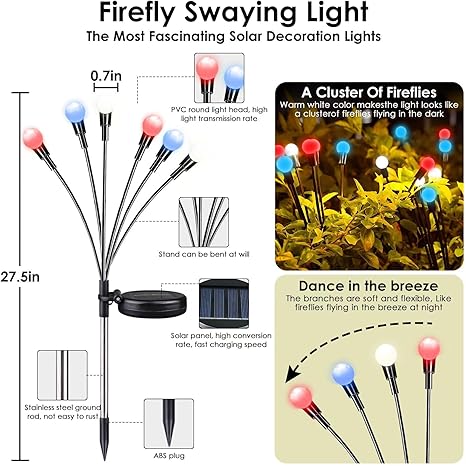 - Waterproof & Easy to Use: Built with IP65 waterproof protection, This firefly solar lights can withstand rain, snow, and heat. Without any tools, simply plug these solar garden lights into the ground outdoors, flip the switch, then it can be used
