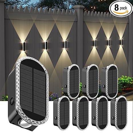 - Holiday Decorations Lights:The solar wall lights radiate beautifully at night. each light has a magnification lens to increase the look of the lights.these fence lighting solar powered come with 2 LEDs, the option to have them light on the top, bottom gives way to a lot of creative options.We can change the colors with the seasons and/or for different party themes.