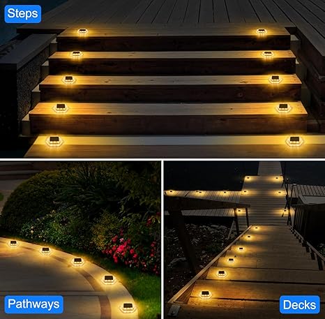 - 【High-efficiency Solar Panel/ Long Lighting Time】Solar Deck Lights are made from monocrystalline silicon solar panels, built-in 1200mAH larger storage battery with a solar conversion rate of up to 22% for faster charging and longer illumination, automatically recharges during the day and glows when night falls. 6-8 hours solar charging time when in good sunshine condition, enough to supply the leds up to 10-12 hours. Avoiding rainy and cloudy days that cannot be charged.