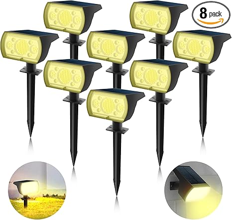 - Upgraded Solar Landscape Lights 8 Packs: 64 LEDs output warm white light brightness up to 1000 lumens. projecting the brightest enough brightness for your yard. A nightly light show, lighting up a larger and brighter area, add life and color to your landscape.