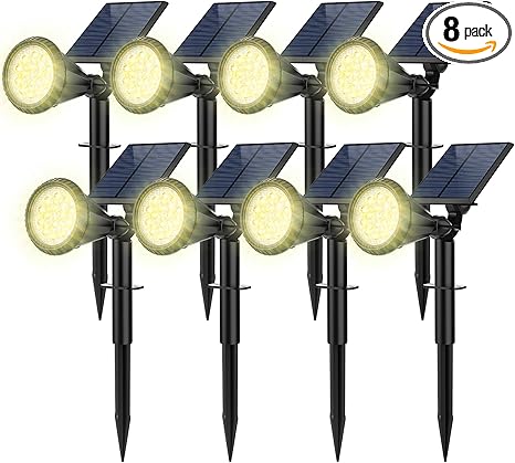 - 【2-in-1 installation】Solar spot lights outdoor are available in two way to install, you can choose between floor plug-in and wall mounting, easy and convenient to install, no wiring and power support required. You can choose to illuminate sculptures, trees and flags upwards or expand the lighting range sideways. Suitable for patios, porches, walkways, pools, courtyards, gardens, garages, driveways, pathways and more.