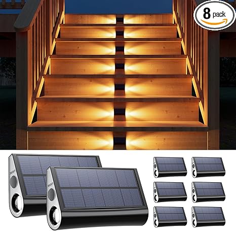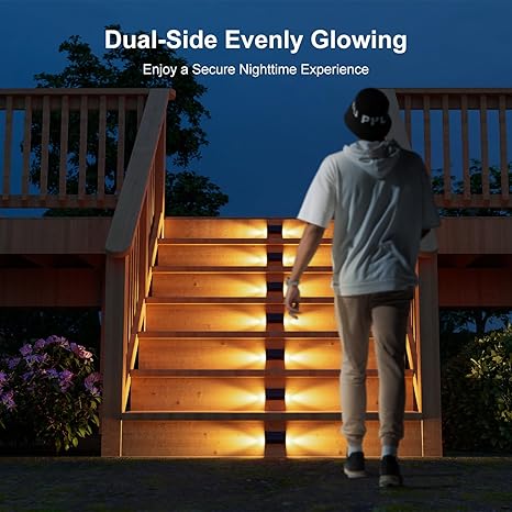 - Dual-Side Lighting for Enhanced Safety: GVSHINE Solar Step Lights feature high-intensity lenses on both sides, delivering focused and even illumination across your steps. This dual-side design ensures that every inch of your staircase is brightly lit, preventing you from falling when going up and down the stairs. The bright light makes it safer for you and your family to move around at night.