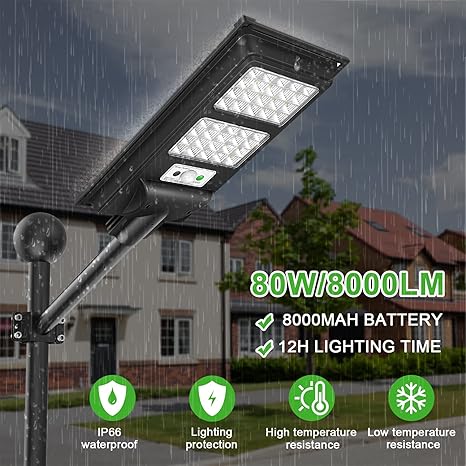 - ⚡[Energy Saving and Super Brighter] This 80W solar street light provides 8000LM daylight white at full night. the light 160pcs high-quality super bright LED chips and a 3.2v/8000mah battery, lifespan of 50000 hours. No need to connect any wires, very Great savings in your electricity bills and installation and maintenance costs