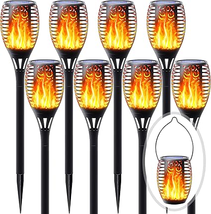 - 【Flickering Solar Torch Lights】 – LED torch lights cast a soft and romantic glow. The solar flame light is a safe alternative to real flame. Dancing flame provides a pleasant campfire ambience for your garden ,yard, party, BBQ, camping, wedding, Christmas, Halloween festival. This solar flame torch light is a amazing outdoor decorative lighting.
