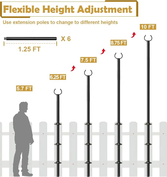 - Height Adjustable and Easy to Install : Unique extra tall string light stake holder can be freely adjustable to 10, 8.8, 7.6, 6.4 or 5.2 feet in height, it varies in height depending on how many extenders would be used. The fairy light pole is easy to install, so each part can be screwed together quickly. No additional tool is required, and just make sure every part of the heavy duty light pole is 100% tightened. Easy to disassemble and store when not in use.