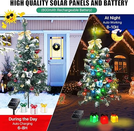 - 【Waterproof, Auto ON/OFF & Easy Installation】: Waterproof grade of the outdoor Christmas tree lights is 65; Charging in the sun during the day, outdoor Christmas lights automatically lit at night; After getting the outdoor Xmas tree, you only need to spread the Christmas branch and plug it into the ground to use, without winding lights and installing decorations, ready-to-use, very simple