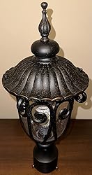 This lamp was selected to replace another mounted on a pillar and no longer working. It took a little work to stabilize the light on the rock pillar but once that was done hook up easy. This light is large and striking. I have other Vianis outdoor lights and have been happy with them all. The dusk to dawn feature is new to my setting and I prefer it over needing to remember to turn the lamp on and off each day. The casing appears water tight. The fixture allows for a 100w lightbulb so the amount of illumination is good. The scrollwork design is very pretty and provides extra charm to the lighting. I am happy with the selection.