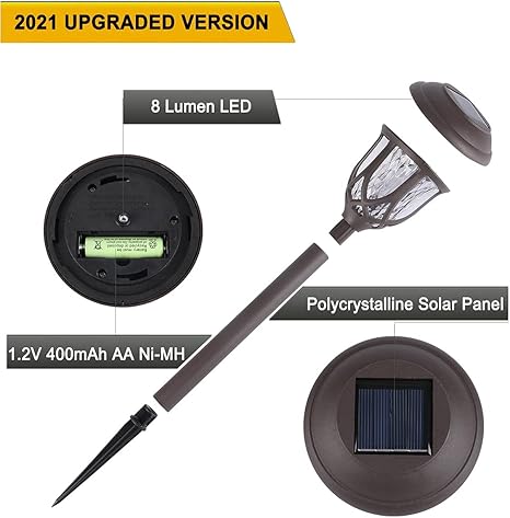 - Solar-powered – Each light contains a solar panel and rechargeable 1X AA 1.2V 400mAh Ni-MH battery for long lasting performance. The battery charges using sunlight. The solar lights automatically turn on at dusk and last up to 8 hours for hassle free illumination.