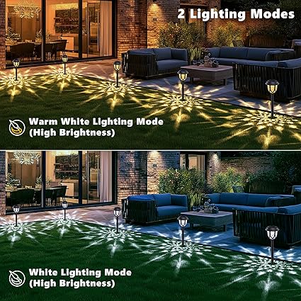 - Super Bright Color Changing Solar Pathway Lights : Upgrade your outdoor spaces with our solar pathway lights. effortlessly switching between warm white for a cozy atmosphere or cool white for crisp modern illumination. Featuring thick, high-strength glass design, these solar lights deliver 360° enhanced brightness and superior light diffusion for maximum visibility.