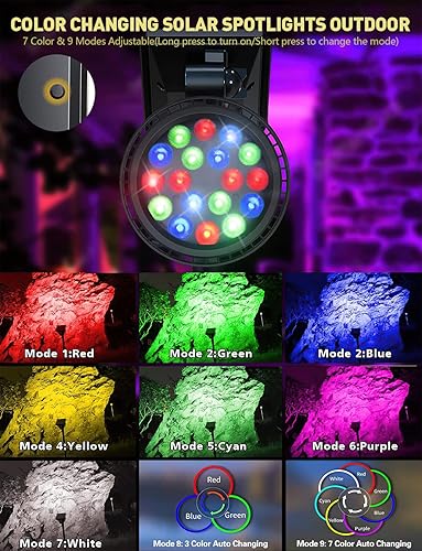 - 【Bright Multicolor Solar Spotlight】Different from the previous color solar spotlights, OSORD color solar landscape spotlight not only provides auto cycle changing color, but also adds color fixed function. You can choose your favorite color, according to the practical scene and holiday theme or personal preference. including: RED,GREEN,BLUE ,YELLOW,CYAN,PURPLE,WHITE. Perfect outdoor halloween Lights, outdoor christmas Lights. Wonderful decoration for your garden ,yard, tree, patio, backyard etc.