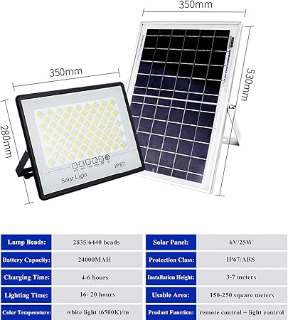 - Larger Battery & Solar Panel : This led solar flood lights built in bigger solar panel and new energy vehicles power battery which are faster charging efficiency and more long spain ,safety and stability than the Lithium iron phosphate battery.