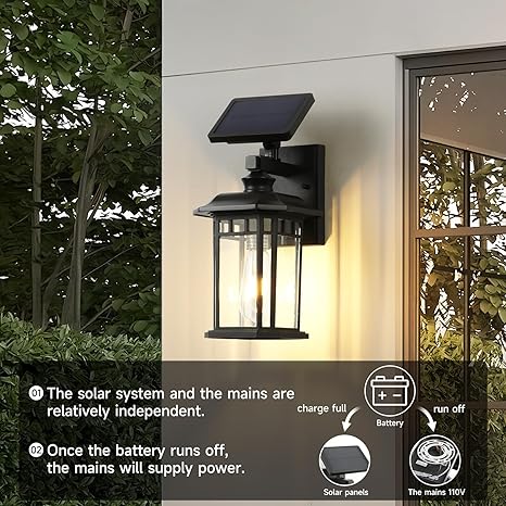 - 【Solar or Hardwired Optional】The solar outdoor wall lights offer 2 powerd option to suit your needs. ①Solar Mode: Wireless Installation. During daytime, when the solar battery is charged, it will auto switch to solar mode at night. ②Hybrid Mode: Hardwired, When the solar battery runs off, the solar powered porch light will auto switch to the electric power mode, creating an eco-friendly energy cycle that ensures uninterrupted operation and maximum energy savings.