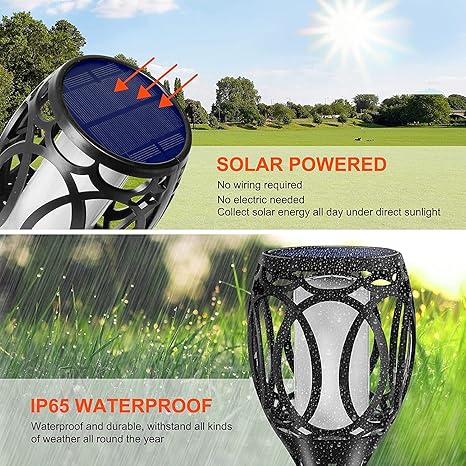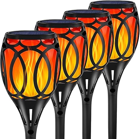 - 🔥DANCING FLICKERING FLAME: Solar powered flashlights flicker with a brilliant dancing flame torch, a safe alternative to a real ‘flame’. Combine multiple flame LEDs together for a more perfect campfire atmosphere!