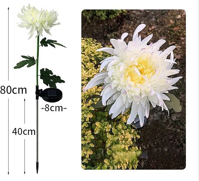 - ▲ BEAUTIFUL AND REALISTIC – Just beautiful, especially at night! Made from a new material and the flower petal is beautifully designed to mimic a real flower. Glow in the dark, these Chrysanthemum solar lights make your garden unique!