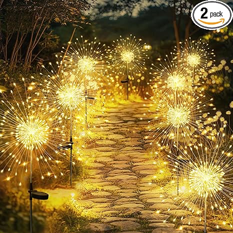 - 【Upgraded Solar Garden Lights】Each pack contains 2 lights, each with 120 LEDs, working with two modes between flashing and steady lighting, easily operated by a button. Suitable for outdoor garden and courtyard decoration, adding beauty and a unique atmosphere to home. Decorate your playhouse, balcony, patio, planters as you like. It is an ideal choice with high quality and durability