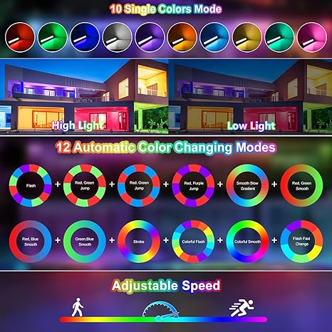 - 【Multiple Color Changing Modes】LED RGB wash light bar outdoor has 10 single colors with high/low light brightness and flash/smooth mode, multiple color changing modes with adjustable speed, which is very flexible to meet your specific lighting needs, you can choose different colors or modes for scenes, decorate your home all year round