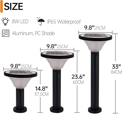 - Wide Application — The solar bollard light uses 3000K warm lighting. You can use the vintage garden landscape lights anywhere, such as decorating the garden, backyard, lawn, party, balcony and so on.