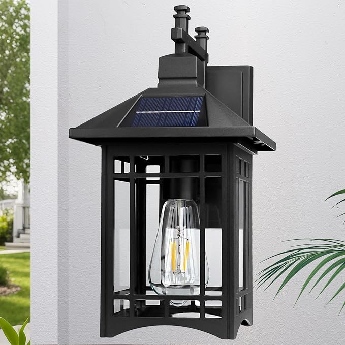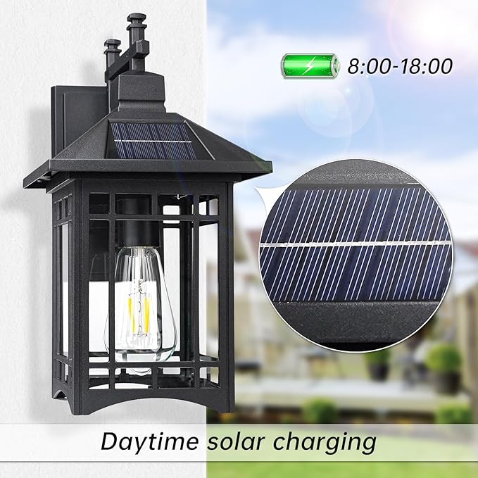 - Eco-friendly and Automatic On/Off Sensor – Solar powered outdoor wall light, save electricity and more convenient. Automatically turn on at dusk and automatically turn off at dawn, Made of durable aluminum metal and water pattern glass, almost maintenance-free. Rust-proof,IP44, shock-resistant and thermally stable, no need to worry about any bad weather.