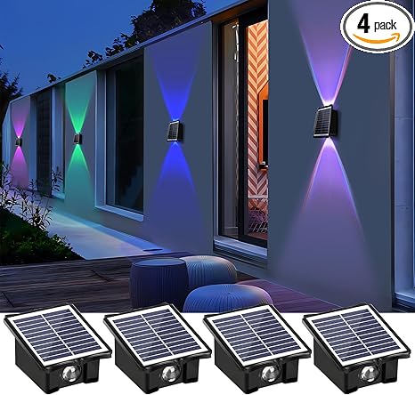 - ▶MULTIPLE COLOR CHANGE OPTIONS: This RGB solar wall light is available in seven light colors in both dynamic and static status. Press the button only once, the solar lights will run through 7 fixed colors in turn: Red, Green, Indigo, Yellow, Purple, Blue, Purple, and Rainbow. Each color will stay for 5-6 seconds. If you need a fixed color, just press the button to the color you want. The color solar wall lights are ideal for decorating your gardens, walls, or your house.