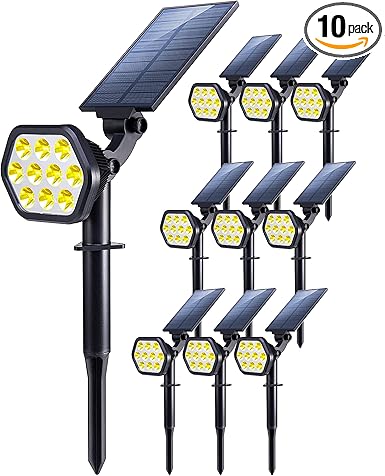 - UPGRADED 10 LED SOLAR OUTDOOR LIGHTS: The advanced solar spot lights outdoor use a higher-efficient solar panel to absorb more sunlight comparing with the previous generation,so it can achieve brighter lightness up to 260 lumens output at night as a garden light or yard light
