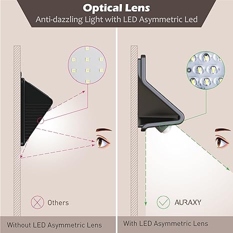 - 【Special Optical Lens Design】 – We specially designed more advanced optical lens for AURAXY motion sensor solar light, which can make the light of solar wall lamp irradiate more evenly on the yard, garden, gate and so on. The specially designed decorative back light allows our motion solar lights outdoor waterproof not only to illuminate your home, but also as an atmosphere light to decorate your home.