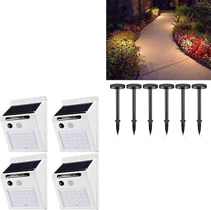 - Bundle Includes: This bundle includes 4-pack outdoor LED solar powered motion sensor light, IP65 Waterproof cordless outdoor wall lighting for patio, 6500K, white and 6-pack landscape pathway lights for sidewalk, 50/100% dimmable, auto dusk to dawn, 2700k soft white /4000k cool white, ip65, 120lm, black