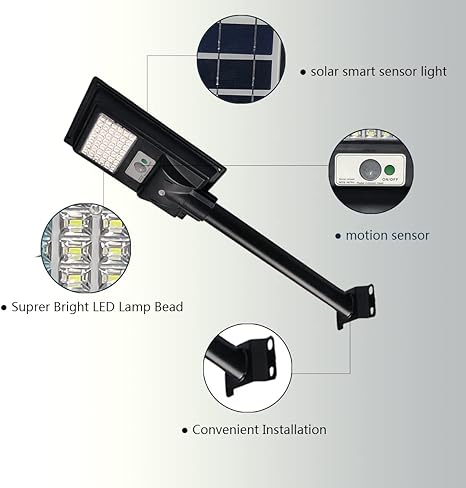 - 【IP65 Waterproof】The solar LED street light has IP65 waterproof rating, which is rainproof, lightningproof and dustproof. This product has been repeatedly tested to withstand extreme weather conditions.