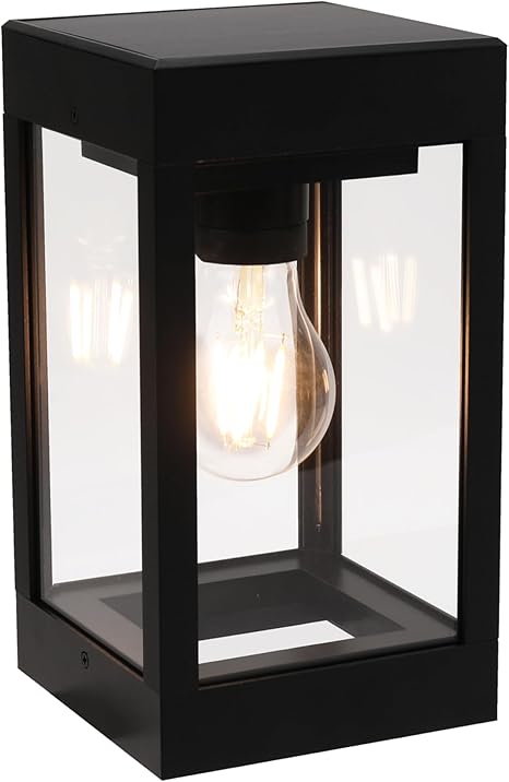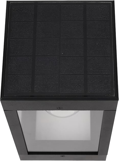 This is a modern appearing solar-charged light. I appreciate that there is no wiring involved as it is totally DIY. It charges with the Sun and stays on most of the night. The fixture comes with a template that allows you to hang the base-holding screws accurately. You then fit the base onto the screws where it can be easily removed. Because I have it situated under a canopy I usually have to remove it daily and let it charge directly under the sunlight. It manages to throw an below-average beam of light. I would think of this as more of a small coverage accent light rather than a light that will provide wide coverage. The LEDS top and bottom spread little illumination and give more of a twinkly effect. I still need to use a recessed light above to provide adequate illumination. This light box seems a little pricey for what it accomplishes but if you like the idea of not needing an electrician or the extra work to wire and install this just might work for you. Just don’t expect the light you would get from an AC powered lamp.