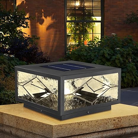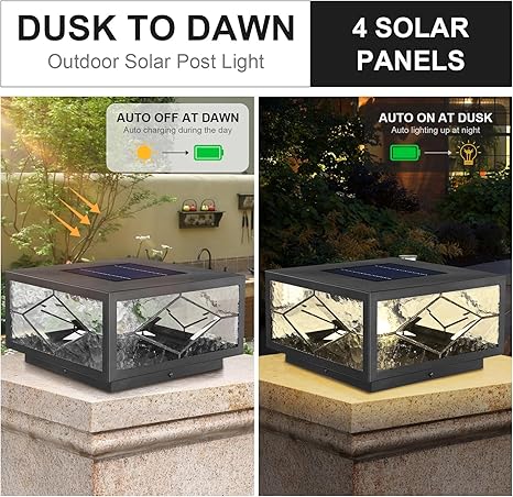 - 【Solar Power】Designed with square solar panels and insert Li-ion rechargeable battery, this solar cap post light can convert sunlight into electricity, dusk to dawn, Placed under a strong direct sunlight, fully charged in 8-10 hours can light 13-15 hours.